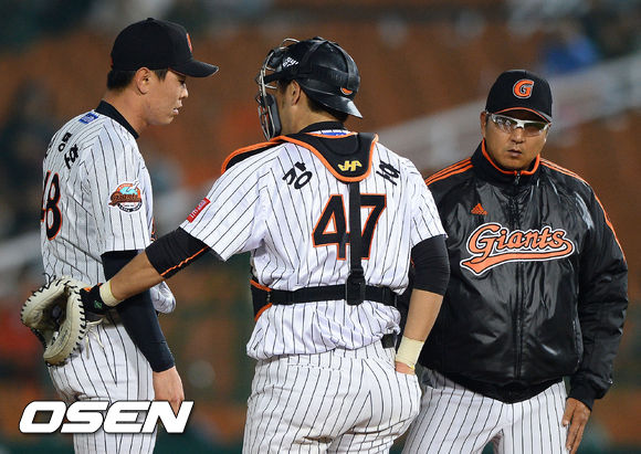 18일 오후 부산 사직구장에서 열린 '2013 한국야쿠르트 세븐 프로야구' 롯데 자이언츠와 넥센 히어로즈의 경기 6회초 3실점 허용한 롯데 진명호 투수가 정민태 투수 코치와 이야기를 나누고 있다
