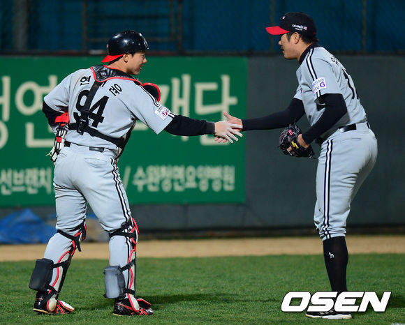 18일 오후 광주구장에서 '2013 한국야쿠르트 세븐 프로야구' KIA 타이거즈 대 LG 트윈스의 경기가 열렸다. 5회말 KIA 공격 1사 만루 상황 8번 김상훈을 내야 땅볼로 이끌며 병살로 이닝을 마무리지은 LG 투수 유원상과 포수 현재윤이 인사를 나누고 있다.