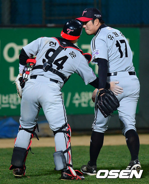 18일 오후 광주구장에서 '2013 한국야쿠르트 세븐 프로야구' KIA 타이거즈 대 LG 트윈스의 경기가 열렸다. 5회말 KIA 공격 1사 만루 상황 8번 김상훈을 내야 땅볼로 이끌며 병살로 이닝을 마무리지은 LG 투수 유원상과 포수 현재윤이 인사를 나누고 있다.