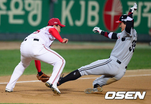 18일 오후 광주구장에서 '2013 한국야쿠르트 세븐 프로야구' KIA 타이거즈 대 LG 트윈스의 경기가 열렸다. 6회초 LG 공격 무사 1루 상황 2번 박용택의 우중간 안타 때 3루까지 내달린 주자 이진영이 KIA 우익수 김상현의 송구를 받은 3루수 이범호의 태그에 걸려 아웃되고 있다.