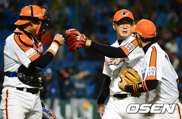 18일 오후 대전 한밭종합운동장 야구장에서 열린 2013 한국야쿠르트 세븐프로야구 한화 이글스와 NC 다이노스의 경기, 8회초 2사 1루에서 한화 송창식이 NC 조평호를 삼진으로 처리하고 포수 정범모와 하이파이브를 하며 덕아웃으로 가고 있다.