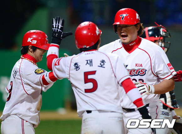 18일 오후 광주구장에서 '2013 한국야쿠르트 세븐 프로야구' KIA 타이거즈 대 LG 트윈스의 경기가 열렸다.6회말 KIA 공격 1사 1, 2루 상황 5번 최희섭이 역전 우월 3점포를 날리고 홈으로 들어오며 동료들의 환영을 받고 있다.