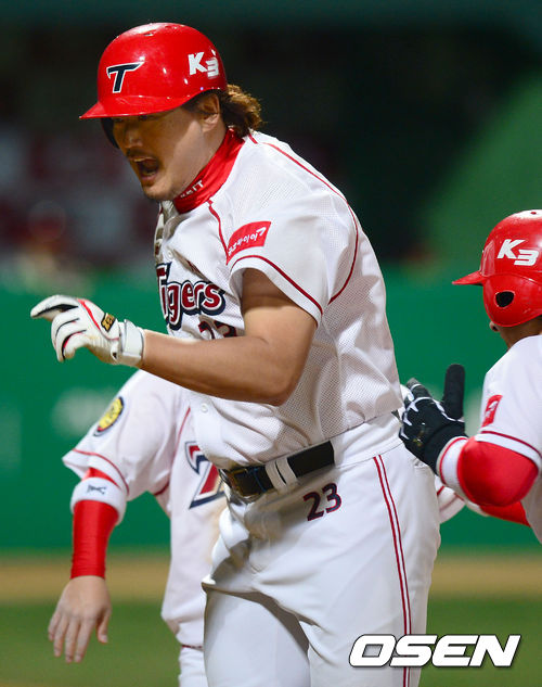 18일 오후 광주구장에서 '2013 한국야쿠르트 세븐 프로야구' KIA 타이거즈 대 LG 트윈스의 경기가 열렸다.6회말 KIA 공격 1사 1, 2루 상황 5번 최희섭이 역전 우월 3점포를 날리고 홈으로 들어오며 환호하고 있다.