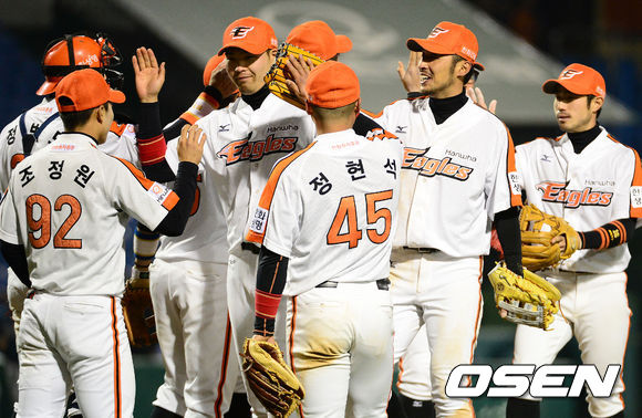 경기 종료 후 한화 선수들이 승리의 기쁨을 나누고 있다. /sunday@osen.co.kr