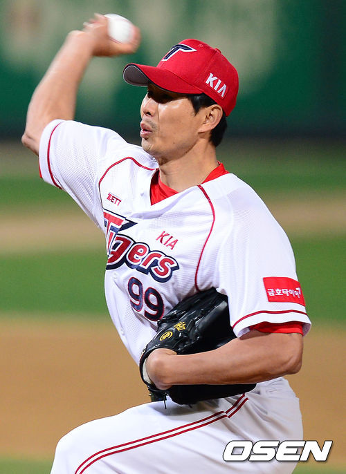 18일 오후 광주구장에서 '2013 한국야쿠르트 세븐 프로야구' KIA 타이거즈 대 LG 트윈스의 경기가 열렸다. 8회초 LG 공격 무사 1루 상황 구원 등판한 KIA 최향남이 힘차게 공을 던지고 있다.