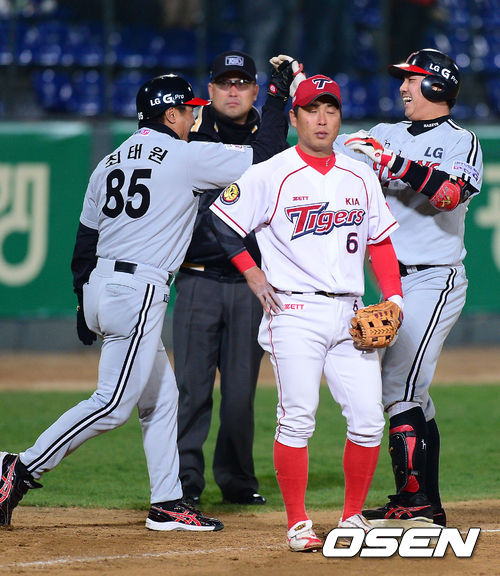 18일 오후 광주구장에서 '2013 한국야쿠르트 세븐 프로야구' KIA 타이거즈 대 LG 트윈스의 경기가 열렸다. 8회초 LG 공격 1사 1, 2루 상황 8번 조윤준이 우익선상으로 빠지는 3루타를 날리고 최태원 3루 코치와 인사를 나누고 있다.