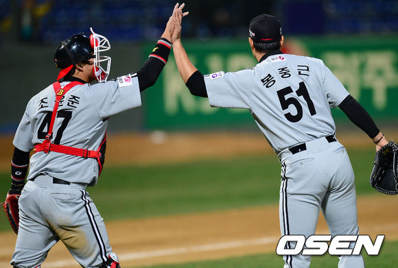 경기를 마무리지으며 세이브를 거둔 LG 마무리투수 봉중근과 포수 조윤준이 인사를 나누고 있다.