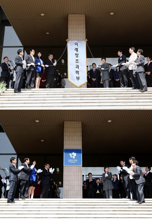 박근혜 대통령, 최문기 미래창조과학부 장관, 이경재 방송통신위원회 위원장 등이 19일 정부과천청사에서 미래창조과학부 현판식을 갖고 있다. 왼쪽부터 이상목 미래창조과학부 제1차관, 이경재 방송통신위원회 위원장, 장서연 미래부 ITU전권회의 준비기획단장, 최문기 미래창조과학부 장관, 박근혜 대통령, 오준호 미래부 기초연구진흥과장, 한선교 국회 미방위 위원장, 윤종록 미래창조과학부 제2차관.