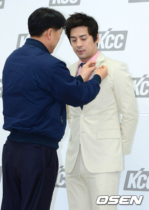 19일 오전 서울 서초동 KCC 사옥에서 열린 MBC 에브리원 대기업 체험 버라이어티 '나인 투 식스' 기자간담회에서 KCC 연규선 이사가 권오중에게 사원 배지를 달아주고 있다.