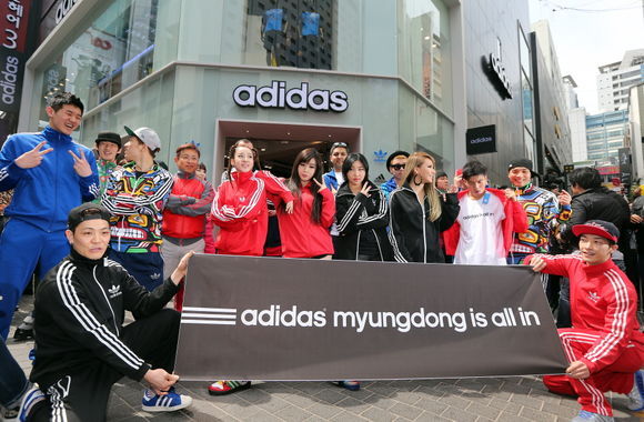 글로벌 스포츠 브랜드 아디다스는 19일, 명동점을 국내 최대 규모 플래그십 스토어로 리뉴얼하고, 이를 기념해 투애니원(2NE1)과 비보이팀 프리픽스 크루(Prepix crew)이 함께하는 댄스 플래시 몹 이벤트를 진행했다.