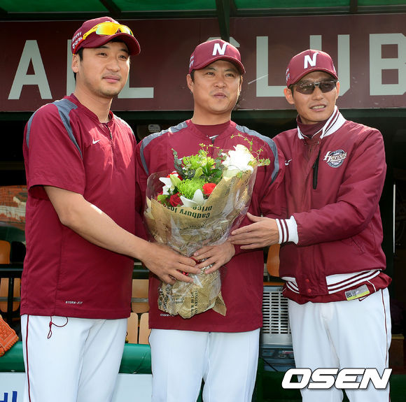 경기에 앞서 트레이드된 넥센 송신영이 선수단과 인사를 나누며 이택근, 염경엽 감독과 포토타임을 하고 있다.