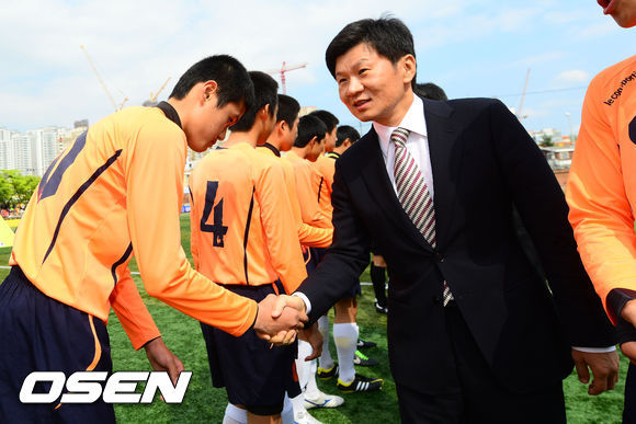 정몽규 대한축구협회 회장이 19일 동래중과 신라중의 2013 대교눈높이 전국 중등 축구리그 공식 개막전을 축하하기 위해 부산 동래중학교를 찾았다.