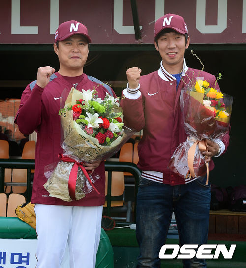 경기에 앞서 트레이드된 넥센 송신영, 신재영이 선수단과 인사를 나누고 포토타임을 하고 있다.