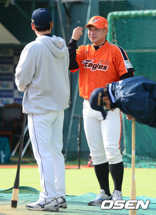 19일 오후 서울 잠실야구장에서 열리는 '2013 한국야쿠르트 세븐 프로야구' 두산 베어스 대 한화 이글스의 경기를 앞두고 한화 정현석이 두산 선수들과 대화를 나누고 있다.
