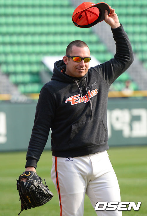 19일 오후 서울 잠실야구장에서 열리는 '2013 한국야쿠르트 세븐 프로야구' 두산 베어스 대 한화 이글스의 경기를 앞두고 한화 외국인투수 이브랜드가 취재진에게 삭발한 머리를 보여주고 있다.