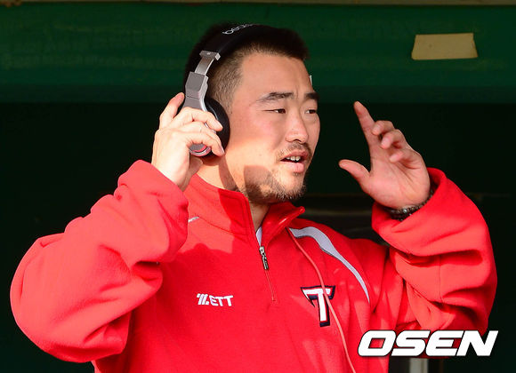 19일 오후 인천 문학구장에서 열리는 '2013 한국야쿠르트 세븐 프로야구' SK 와이번스와 KIA 타이거즈의 경기 시작 전 김진우가 덕아웃에서 음악을 듣고 있다.
