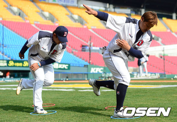 19일 오후 서울 잠실야구장에서 열리는 '2013 한국야쿠르트 세븐 프로야구' 두산 베어스 대 한화 이글스의 경기를 앞두고 두산 홍성흔과 최재훈이 점프 훈련을 하고 있다.