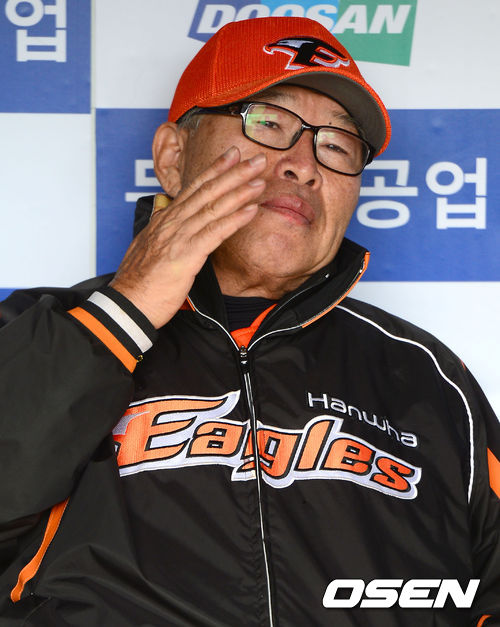 19일 오후 서울 잠실야구장에서 열리는 '2013 한국야쿠르트 세븐 프로야구' 두산 베어스 대 한화 이글스의 경기를 앞두고 한화 김응룡 감독이 취재진의 셔터 세례에 얼굴을 만지는 제스처를 취하고 있다.