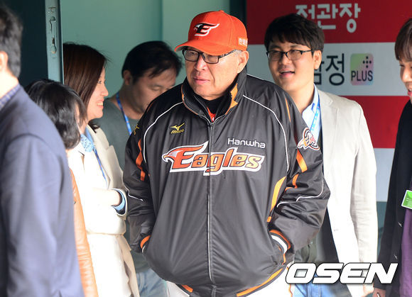 19일 오후 서울 잠실야구장에서 열리는 '2013 한국야쿠르트 세븐 프로야구' 두산 베어스 대 한화 이글스의 경기를 앞두고 한화 김응룡 감독이 취재진과 대화를 나누기 위해 덕아웃으로 들어서고 있다.