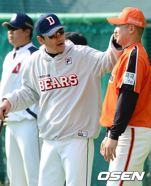 19일 오후 서울 잠실야구장에서 열리는 '2013 한국야쿠르트 세븐 프로야구' 두산 베어스 대 한화 이글스의 경기를 앞두고 두산 김민재 코치와 한화 정현석이 대화를 나누고 있다.