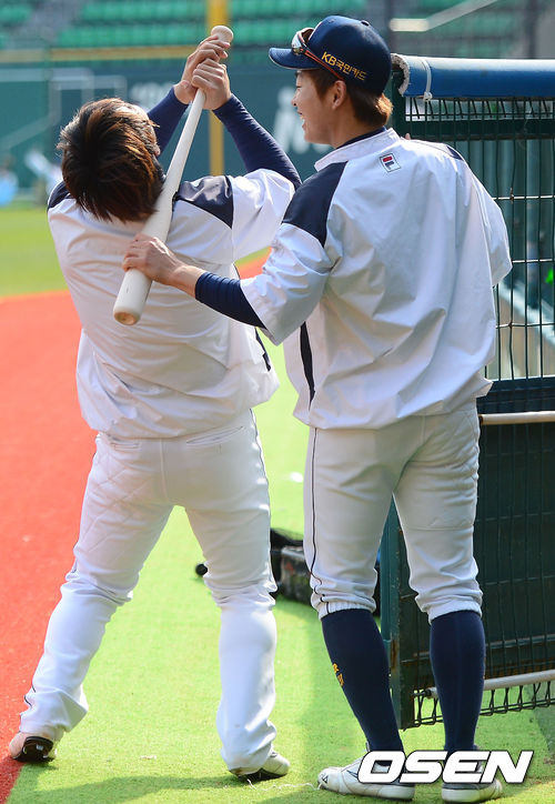 19일 오후 서울 잠실야구장에서 열리는 '2013 한국야쿠르트 세븐 프로야구' 두산 베어스 대 한화 이글스의 경기를 앞두고 두산 민병헌과 정수빈이 장난을 치고 있다.