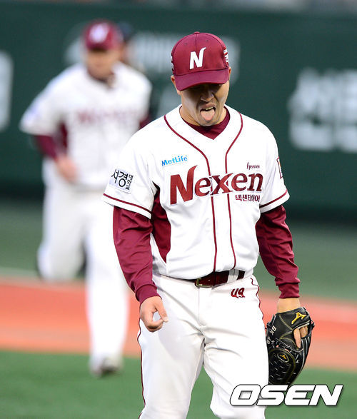 1회초 2사에서 넥센 김병현이 NC 조영훈을 우익수 플라이로 처리하고 더그아웃으로 향하고 있다.