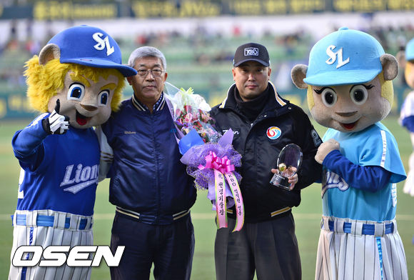 19일 오후 대구구장에서 열린 '2013 한국야쿠르트 세븐 프로야구' 삼성 라이온즈와 롯데 자이언츠의 경기, 경기에 앞서 원현식 심판이 1000경기 출장 시상식을 갖고 유남호 경기감독관과 포즈를 취하고 있다
