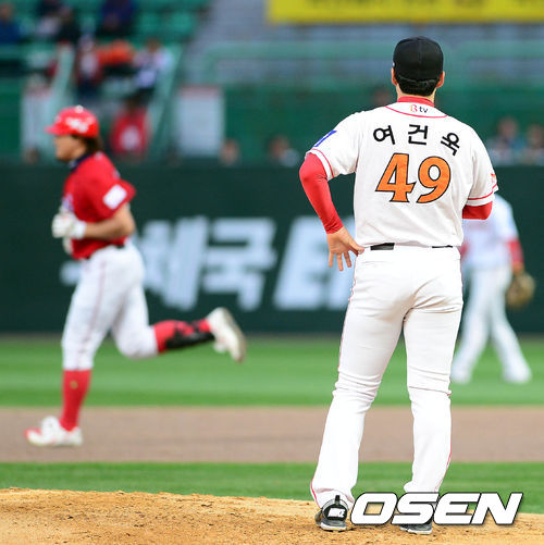 19일 오후 인천 문학구장에서 열린 '2013 한국야쿠르트 세븐 프로야구' SK 와이번스와 KIA 타이거즈의 경기 1회초 2사 1,2루 최희섭에게 스리런포를 내준 여건욱이 마운드에 서 있다.
