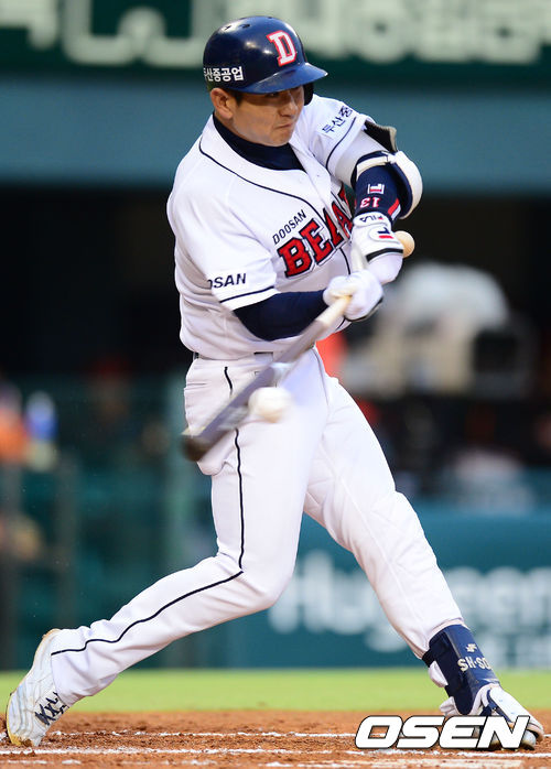 19일 오후 서울 잠실야구장에서 '2013 한국야쿠르트 세븐 프로야구' 두산 베어스 대 한화 이글스의 경기가 열렸다. 1회말 두산 공격 무사 2루 상황 2번 손시헌이 선제 1타점 적시 2루타를 날리고 있다.