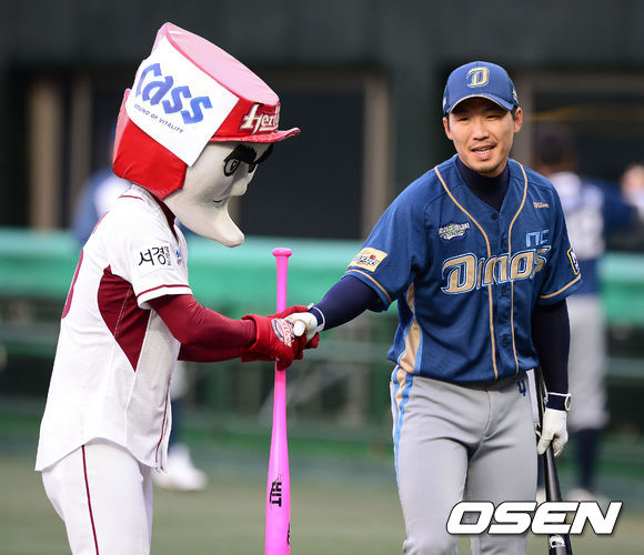 경기에 앞서 넥센 턱돌이가 NC 지석훈과 인사를 나누고 있다.