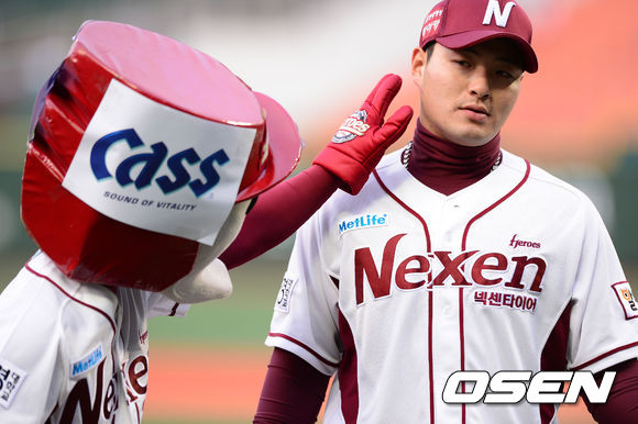 경기에 앞서 넥센 턱돌이가 박병호 얼굴에 손을 대려 하자 박병호가 피하고 있다.