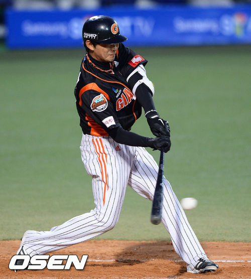 19일 오후 대구구장에서 열린 '2013 한국야쿠르트 세븐 프로야구' 삼성 라이온즈와 롯데 자이언츠의 경기, 3회초 무사 2루 롯데 박기혁이 선취 1타점 적시타를 날리고 있다