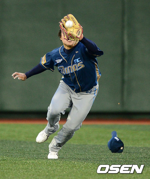 2회말 무사 1루에서 NC 권희동이 넥센 이성열의 타구를 전력질주해 잡아내고 있다.
