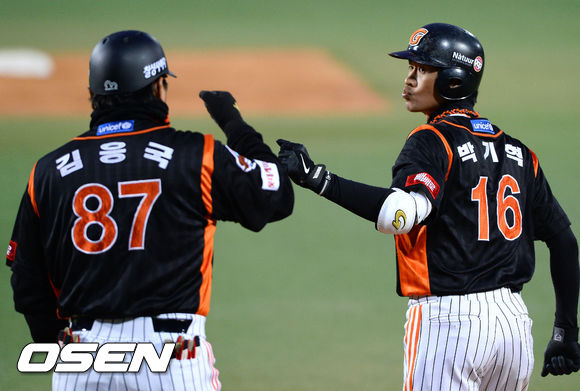19일 오후 대구구장에서 열린 '2013 한국야쿠르트 세븐 프로야구' 삼성 라이온즈와 롯데 자이언츠의 경기, 3회초 무사 2루 롯데 박기혁이 선취 1타점 적시타를 날리고 김응국 코치와 하이파이브를 하고 있다