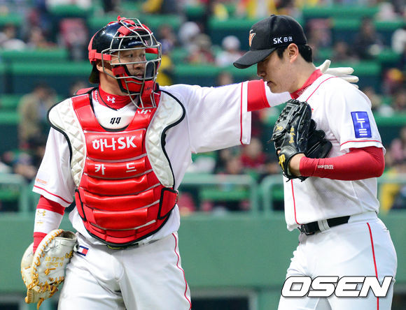 19일 오후 인천 문학구장에서 열린 '2013 한국야쿠르트 세븐 프로야구' SK 와이번스와 KIA 타이거즈의 경기 3회초를 마친 여건욱이 덕아웃으로 향하며 조인성의 격려를 받고 있다.