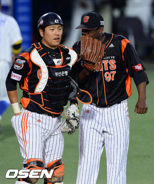 19일 오후 대구구장에서 열린 '2013 한국야쿠르트 세븐 프로야구' 삼성 라이온즈와 롯데 자이언츠의 경기, 2회말 실점 위기를 넘긴 롯데 유먼 선발투수가 강민호 포수와 이야기를 나누고 있다