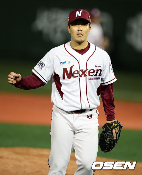 4회초 2사 2루에서 넥센 김병현이 NC 이호준을 우익수 플라이로 처리하고 주먹을 불끈쥐고 있다.