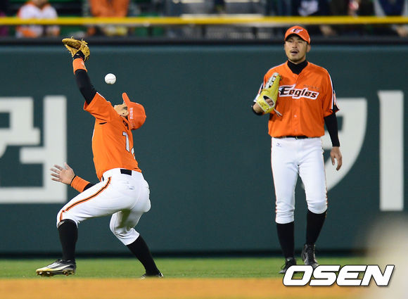 19일 오후 서울 잠실야구장에서 '2013 한국야쿠르트 세븐 프로야구' 두산 베어스 대 한화 이글스의 경기가 열렸다. 2회말 두산 공격 1사 3루 상황 4번 김동주의 플라이타구를 한화 유격수 이대수가 놓치고 있다.