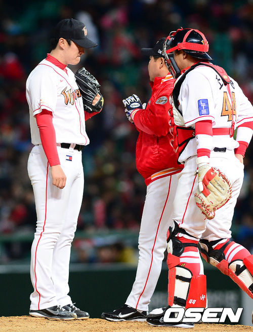 19일 오후 인천 문학구장에서 열린 '2013 한국야쿠르트 세븐 프로야구' SK 와이번스와 KIA 타이거즈의 경기 4회초 선두타자 안치홍에게 2루타를 내준 여건욱이 마운드를 내려가고 있다.