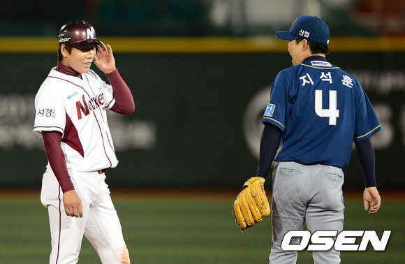 4회말 2사에서 넥센 강정호가 2루 도루에 성공하고 NC 지석훈과 이야기를 나누고 있다.
