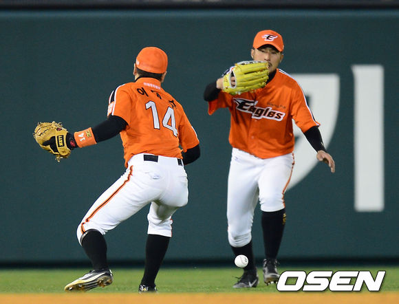 19일 오후 서울 잠실야구장에서 '2013 한국야쿠르트 세븐 프로야구' 두산 베어스 대 한화 이글스의 경기가 열렸다. 2회말 두산 공격 1사 3루 상황 4번 김동주의 플라이타구를 한화 유격수 이대수가 놓치고 있다. 오른쪽은 한화 좌익수 김경언.