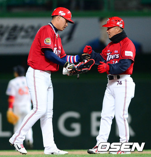 19일 오후 인천 문학구장에서 열린 '2013 한국야쿠르트 세븐 프로야구' SK 와이번스와 KIA 타이거즈의 경기 4회초 무사 2루 1타점 2루타를 친 김상현이 김평호 코치와 하이파이브를 하고 있다.