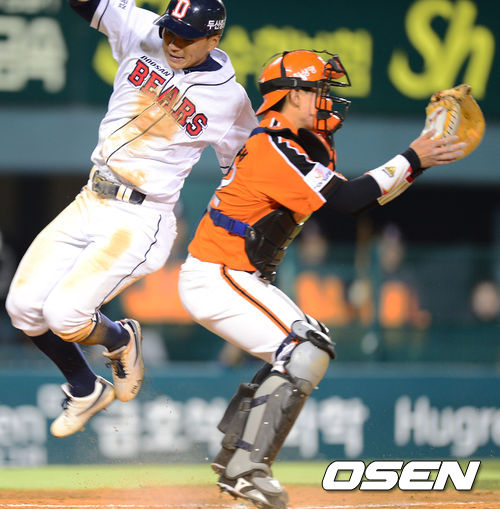 19일 오후 서울 잠실야구장에서 '2013 한국야쿠르트 세븐 프로야구' 두산 베어스 대 한화 이글스의 경기가 열렸다. 3회말 두산 공격 1사 3루 상황 2번 손시헌의 중견수 플라이 때 3루 주자 이종욱이 홈으로 쇄도하며 한화 포수 한승택의 태그를 피해 점프하고 있다. 하지만 홈을 제때 밟지 못해 아웃.