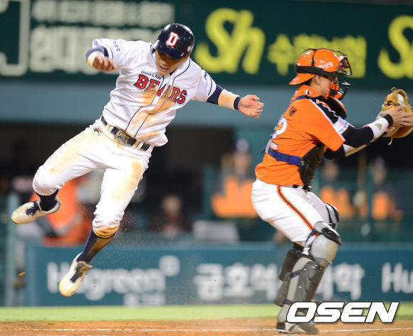 19일 오후 서울 잠실야구장에서 '2013 한국야쿠르트 세븐 프로야구' 두산 베어스 대 한화 이글스의 경기가 열렸다. 3회말 두산 공격 1사 3루 상황 2번 손시헌의 중견수 플라이 때 3루 주자 이종욱이 홈으로 쇄도하며 한화 포수 한승택의 태그를 피해 점프하고 있다. 하지만 홈을 제때 밟지 못해 아웃.