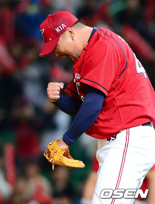 19일 오후 인천 문학구장에서 열린 '2013 한국야쿠르트 세븐 프로야구' SK 와이번스와 KIA 타이거즈의 경기 5회말 1사 만루 임훈을 병살로 처리하면서 만루위기를 넘긴 김진우가 환호하고 있다.
