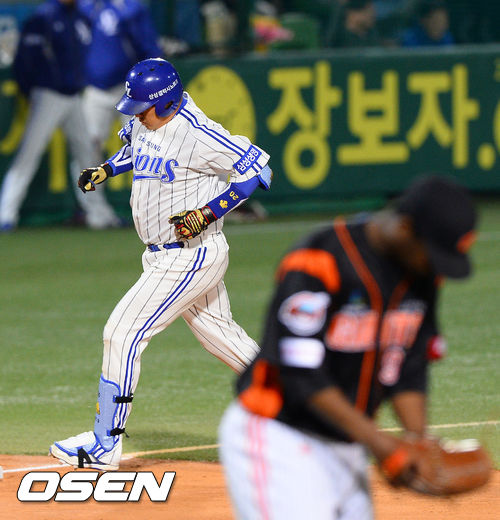 19일 오후 대구구장에서 열린 '2013 한국야쿠르트 세븐 프로야구' 삼성 라이온즈와 롯데 자이언츠의 경기, 7회말 삼성 선두타자 진갑용이 솔로홈런을 날리고 베이스를 돌고 있다