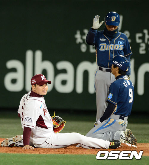 9회초 무사에서 NC 김종호가 2루수 땅볼에 1루에서 헤드 퍼스트 슬라이딩으로 넥센 박병호에 앞서 세이프되고 있다.