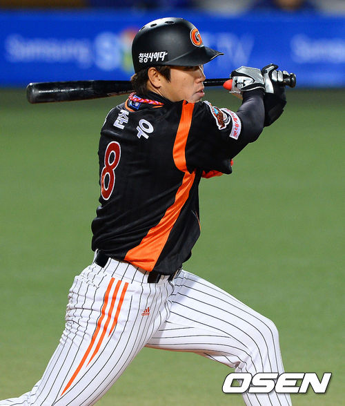 19일 오후 대구구장에서 열린 '2013 한국야쿠르트 세븐 프로야구' 삼성 라이온즈와 롯데 자이언츠의 경기, 8회초 무사 3루 전준우가 1타점 적시타를 날리고 있다