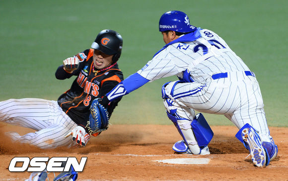 19일 오후 대구구장에서 열린 '2013 한국야쿠르트 세븐 프로야구' 삼성 라이온즈와 롯데 자이언츠의 경기, 8회초 1사 3루 롯데 박종윤의 내야땅볼때 삼성 진갑용 포수가 3루 주자 전준우를 태그아웃 시키고 있다