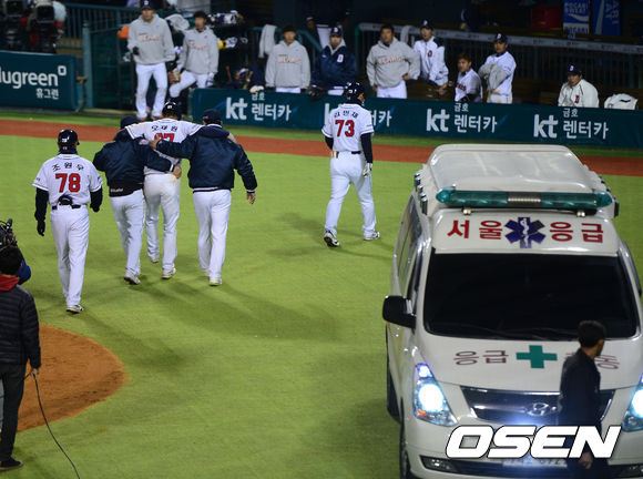 19일 오후 서울 잠실야구장에서 '2013 한국야쿠르트 세븐 프로야구' 두산 베어스 대 한화 이글스의 경기가 열렸다. 6회말 두산 공격 1사 3루 상황 7번 허경민의 중견수 플라이때 홈으로 쇄도한 오재원이 포수 한승택과의 충돌로 부상을 입은 뒤 부축을 받으며 더그아웃으로 들어가고 있다.